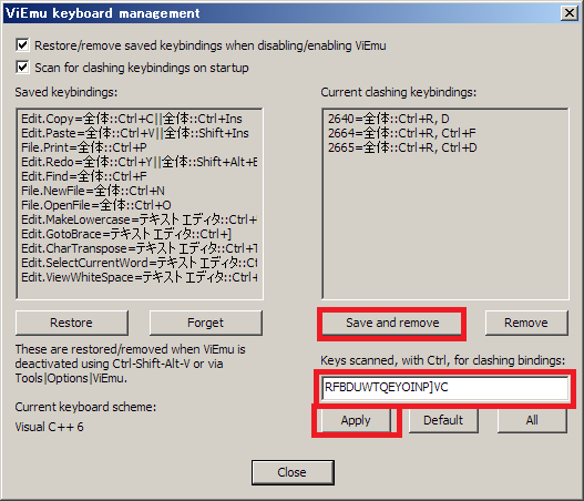これを置き換えたい(つまり、Viのキーバインドにしたい)場合には、その下にある「Save and Remove」を押す。